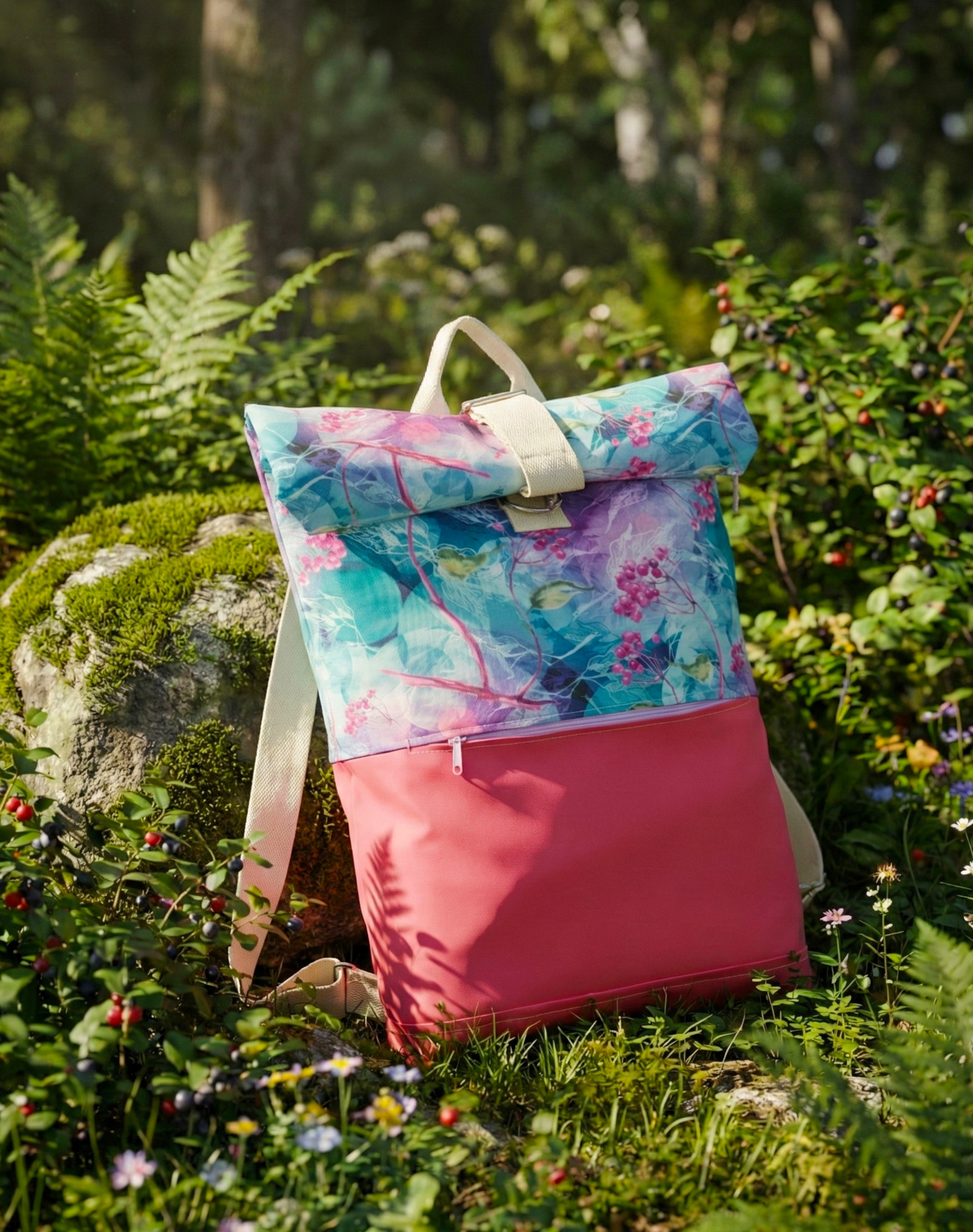 Tento designový roll-up batoh šijeme s tyrkysovými květy, které navozují pocit snu.