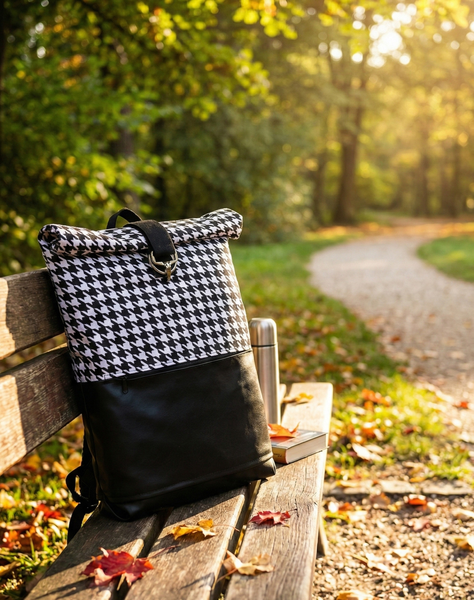 Tento designový roll-up batoh šijeme z jednobarevné černé koženky a z kočárkoviny se vzorem kohoutí stopy.