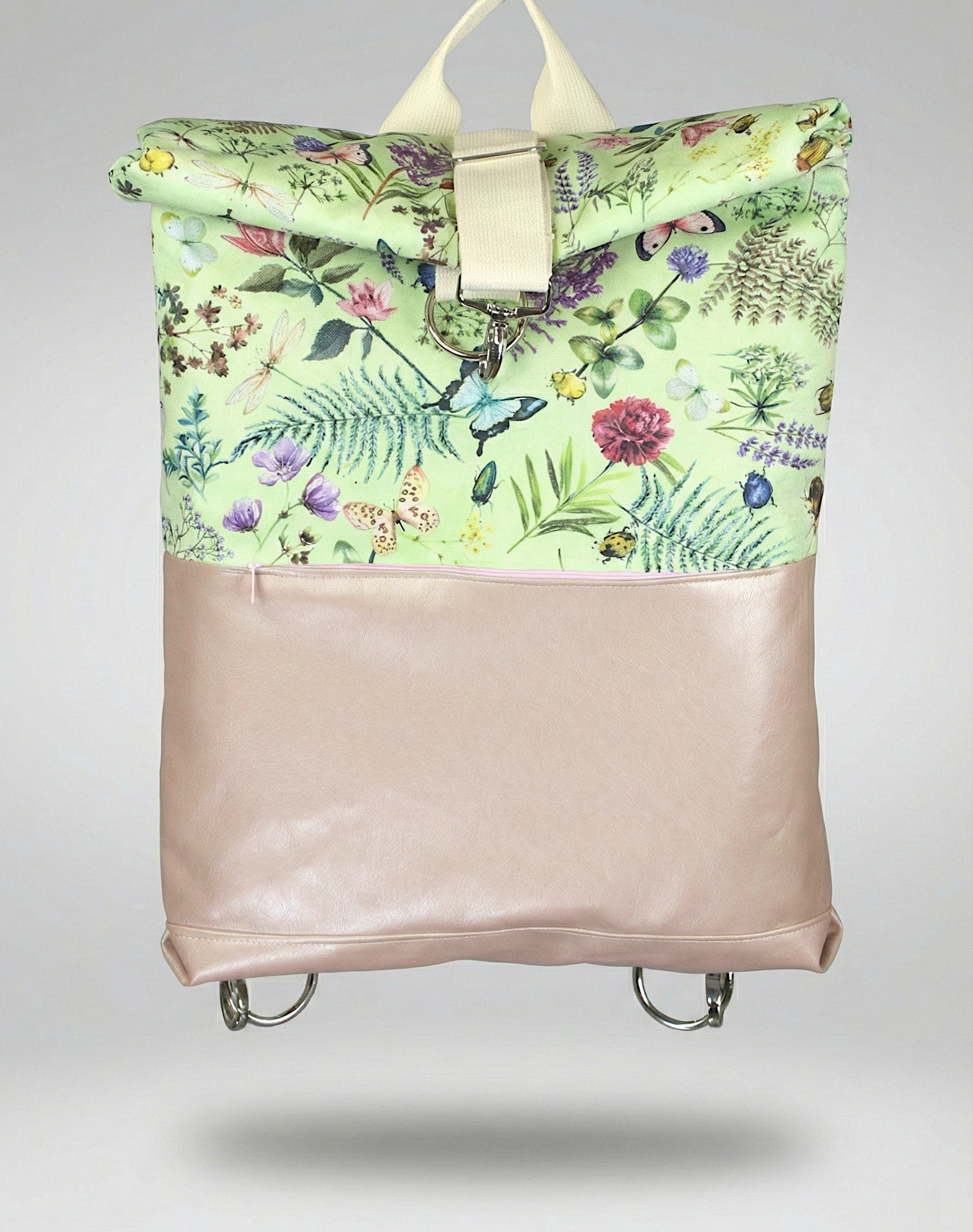 Designový roll-up batoh jistě potěší milovnice lučních vzorů. Šijeme jej z kočárkoviny se vzorem lučních květů a růžovozlaté koženky.
