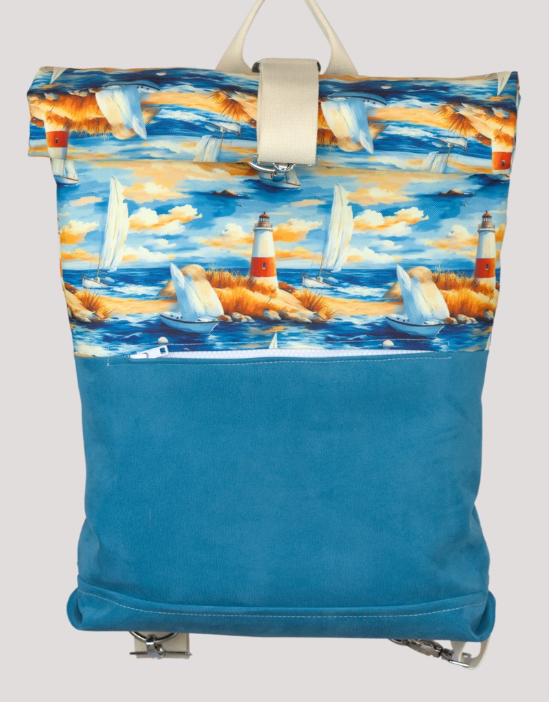Tento designový roll-up batoh šijeme z jednobarevné tyrkysové koženky a z kočárkoviny s motivy moře a majáků, abychom se naladili na čas léta a dovolených. Batoh má rozměry 36×60 cm (jako srolovaný pak 36×40 cm).