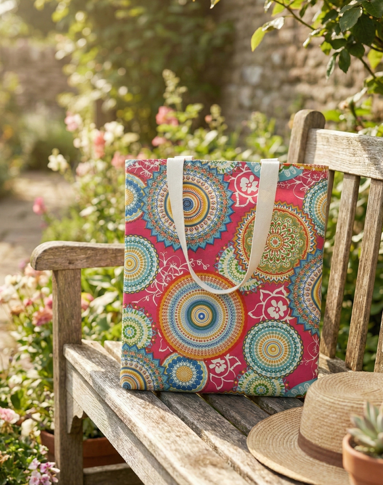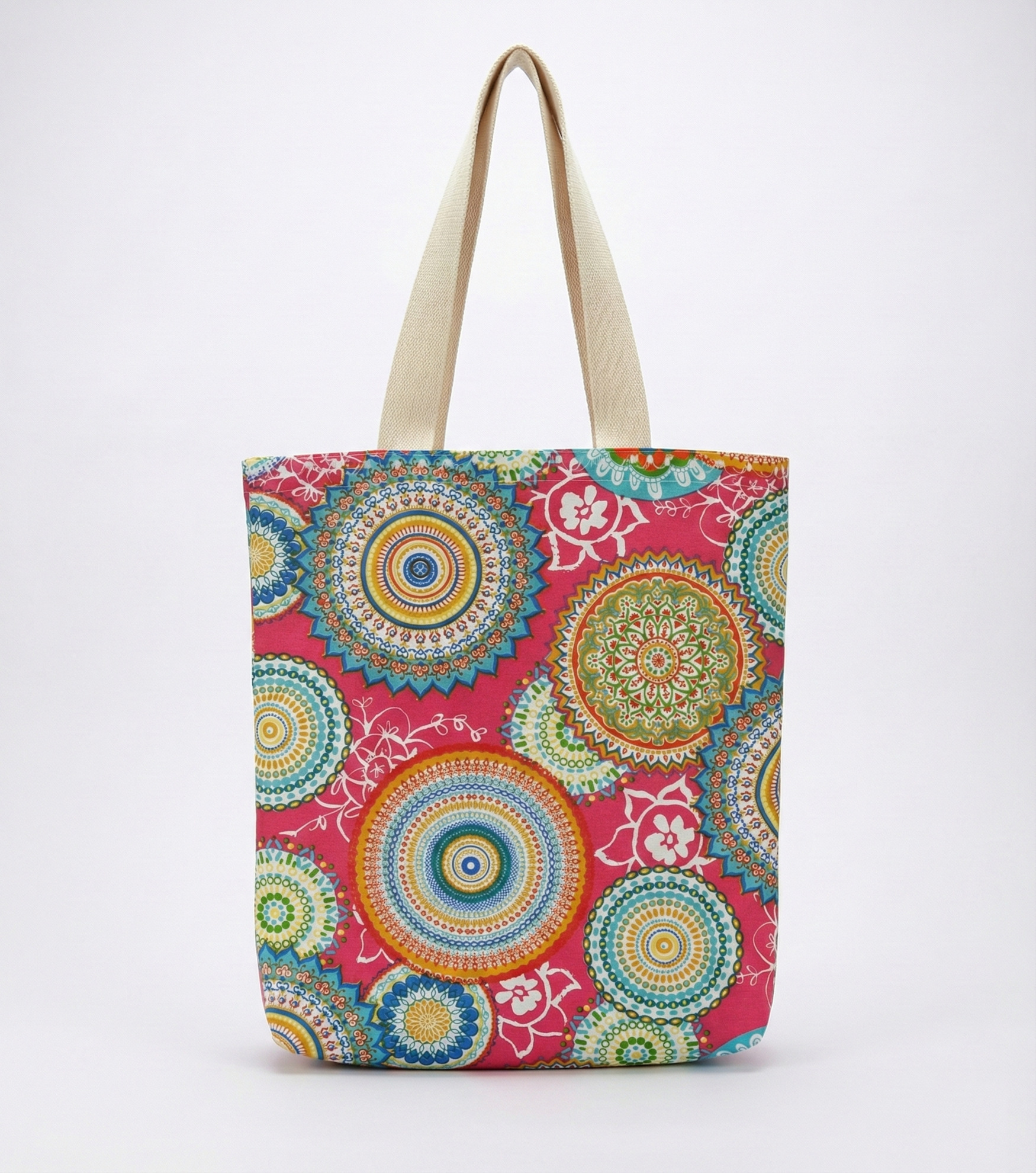 Originální látková taška s výrazným mandalovým motivem na sytě růžovém podkladu rozzáří každý váš den! Praktická a stylová zároveň – ideální na nákup, na cesty i jako doplněk k outfitu.