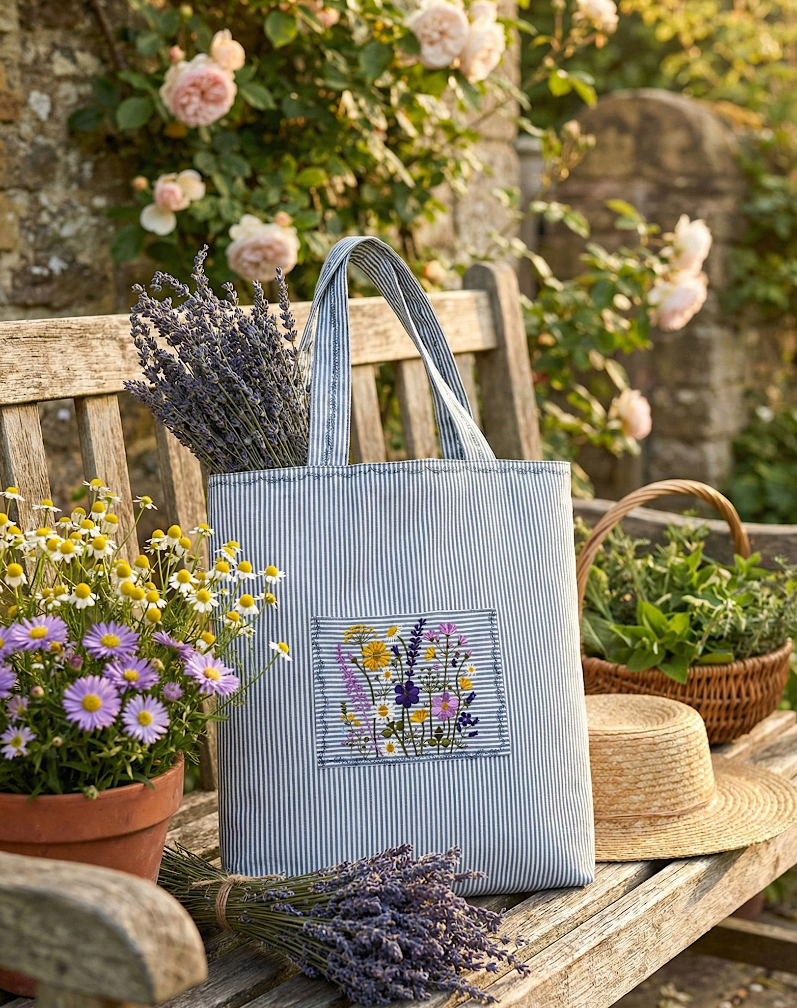 Originální taška z jemně modré proužkované bavlny zaujme na první pohled vyšívanou kapsou na přední straně. Výšivka s motivem lučních květin dodává tašce jemný, přírodní nádech a jedinečný vzhled.